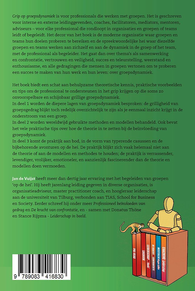 Meer over Jan de VuijstGrip op groepsdynamiek is voor professionals die werken met groepen. Het is geschreven voor interne en externe leidinggevenden, coaches, facilitatoren, mediators, mentoren, adviseurs – voor elke professional die rondloopt in organisaties en groepen of teams leidt of begeleidt. Het decor van het boek is de moderne organisatie waar groepen en teams hun doelen proberen te bereiken en de spreekwoordelijke hei waar diezelfde groepen en teams werken aan zichzelf en aan de dynamiek in de groep of het team, met de professional als begeleider. Het gaat dan over thema’s als samenwerking en confrontatie, vertrouwen en veiligheid, succes en teleurstelling, weerstand en enthousiasme, en alle gedragingen die mensen in groepen vertonen om te proberen een succes te maken van hun werk en hun leven: over groepsdynamiek. Het boek biedt een schat aan behulpzame theoretische kennis, praktische voorbeelden en tips om de professional te ondersteunen in het grip krijgen op die soms zo onvoorspelbare en schijnbaar grillige groepsdynamiek. In deel 1 worden de diepere lagen van groepsdynamiek besproken: de grilligheid van groepsgedrag blijkt toch redelijk overzichtelijk te zijn als je eenmaal inzicht krijgt in de onderstroom van een groep. In deel 2 worden wereldwijd gebruikte methoden en modellen behandeld. Ook bevat het vele praktische tips over hoe de theorie in te zetten bij de beïnvloeding van groepsdynamiek. In deel 3 komt de praktijk aan bod, in de vorm van typerende casussen en de bijbehorende avonturen op de hei. De praktijk blijkt zich vaak helemaal niet aan de theorie of aan de modellen en methodes te houden; de praktijk is verrassender, levendiger, vrolijker, emotioneler, en aanzienlijk fascinerender dan de theorie en modellen doen vermoeden. Met illustraties van Eric J. Coolen en Laurent Berset