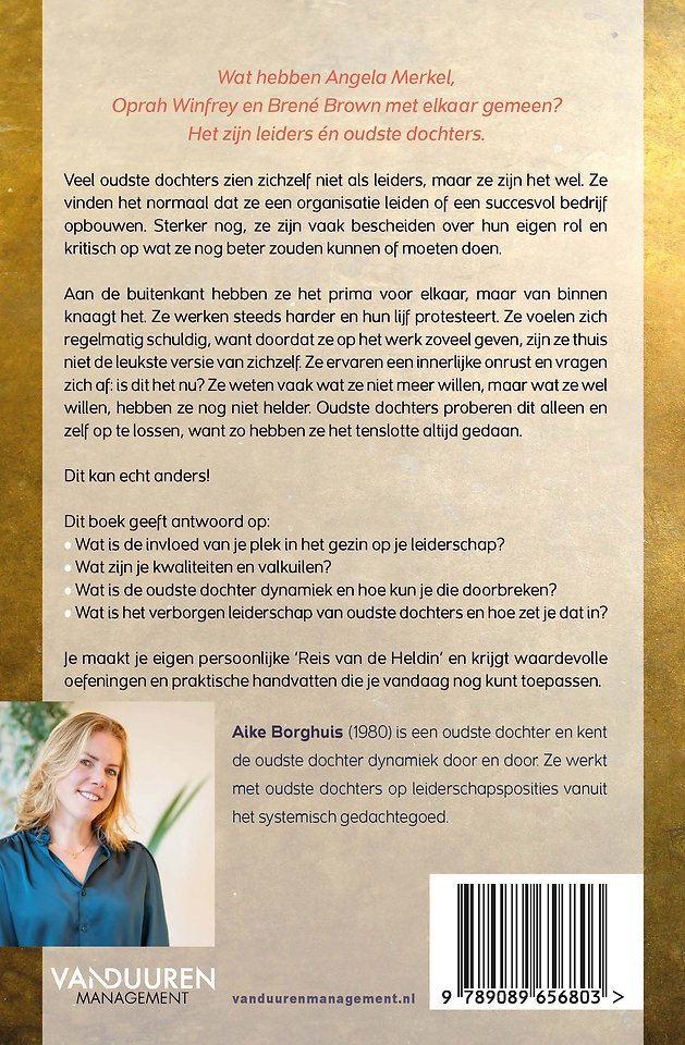 Aike Borghuis (1980) is een oudste dochter. Dochter en kleindochter van een oudste dochter. Zelf is ze moeder van twee dochters. Ze kent de oudste dochter dynamiek dus door en door. Sinds 2010 werkt ze vanuit het systemisch gedachtegoed. Toen ze bij ‘toeval’ ontdekte dat bijna al haar klanten oudste dochter zijn, is ze zich daarin gaan specialiseren.